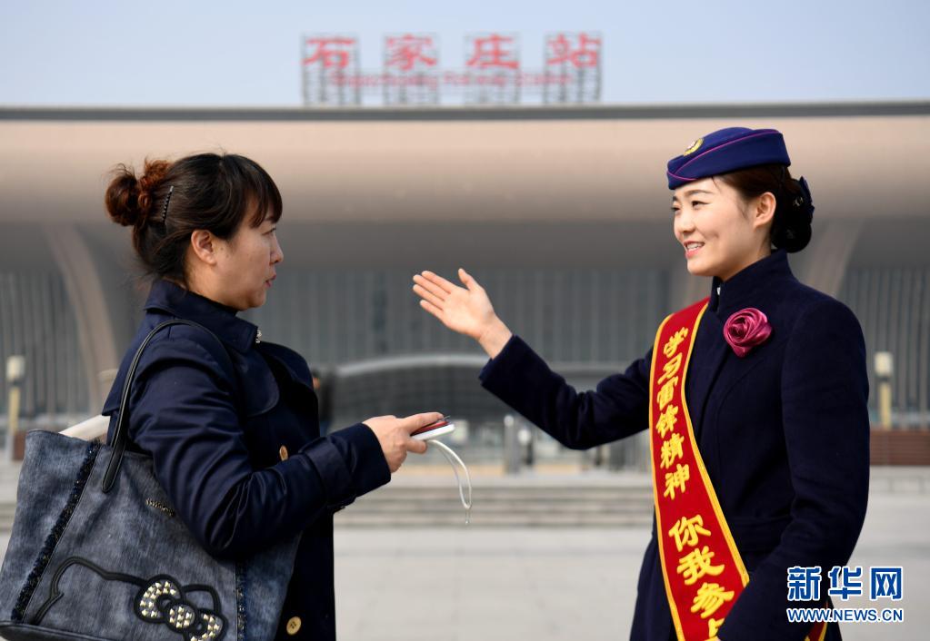 2019年3月5日,在石家莊站廣場,中國鐵路北京局集團(tuán)有限公司京鐵列服公司石家莊分公司高鐵餐吧部的工作人員引導(dǎo)一名旅客前往候車位置。新華社記者 王曉 攝