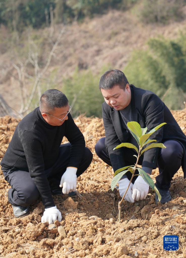 2月25日,漢濱區(qū)建民街道青春村支部副書記唐振(右)在村子產(chǎn)業(yè)園種植枇杷樹(shù)。