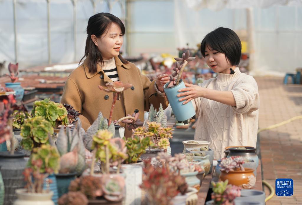 2月24日,漢濱區(qū)建民街道忠誠(chéng)村黨支部委員、村監(jiān)委會(huì)主任胡代芝(右)在村子大棚內(nèi)向游客介紹多肉盆景。