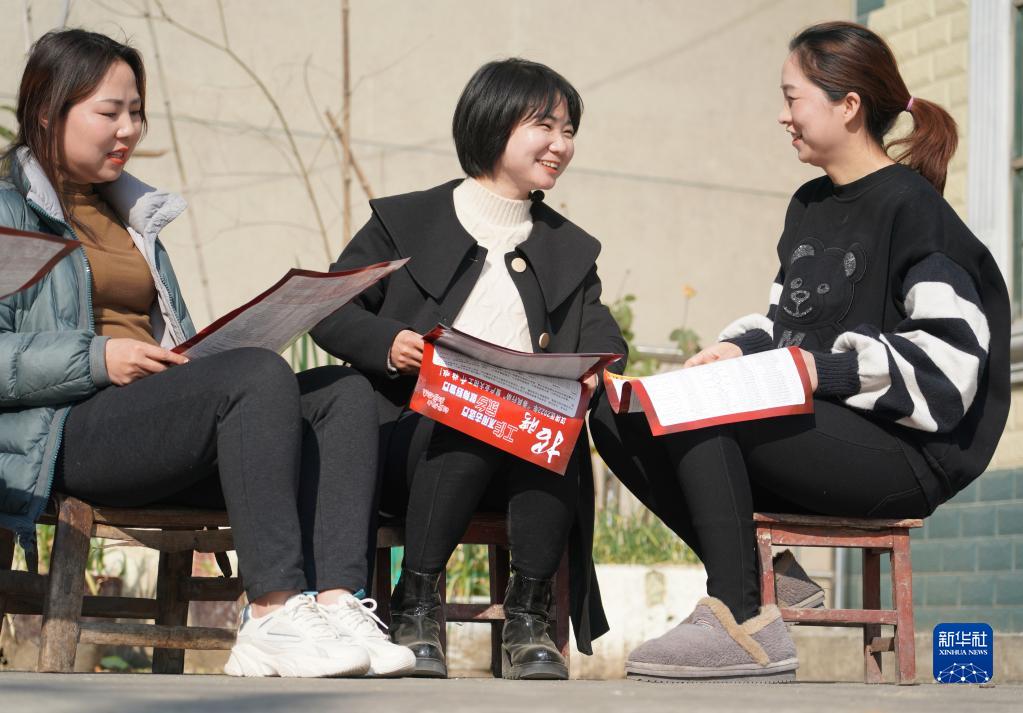 2月24日,漢濱區(qū)建民街道忠誠(chéng)村黨支部委員、村監(jiān)委會(huì)主任胡代芝(中)向村民發(fā)放講解社區(qū)工廠招聘彩頁(yè)。