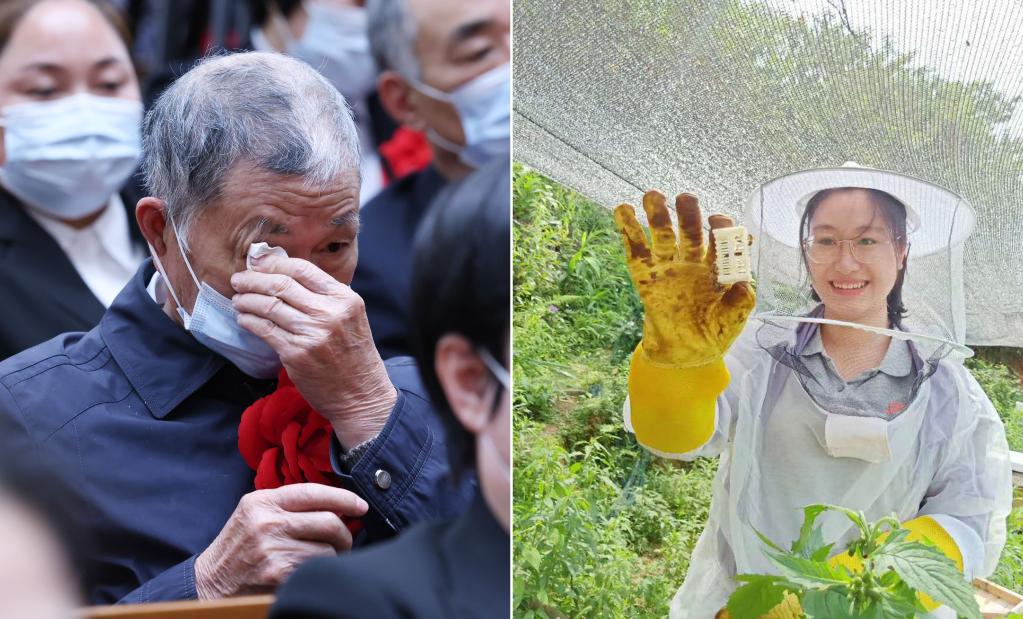 拼版照片:左圖為2021年2月25日,黃文秀的父親黃忠杰在全國脫貧攻堅表彰大會上(新華社記者劉彬攝);右圖為黃文秀生前工作照(資料照片)。