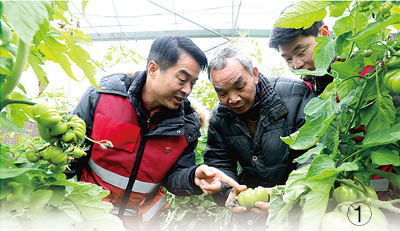 圖①:廣西壯族自治區(qū)融安縣大良鎮(zhèn)古蘭村,駐村第一書記(左)給農戶講解番茄管護知識。