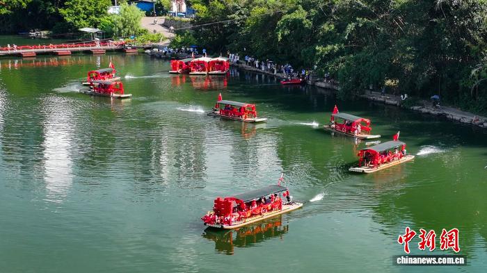 農(nóng)歷七月初七是中國(guó)傳統(tǒng)七夕節(jié)。8月30日,在中國(guó)最年輕的瑤族自治縣——廣西桂林市恭城瑤族自治縣茶江河上,一場(chǎng)主題為“瑤韻七夕·情定瑤鄉(xiāng)”的水上婚禮上演。當(dāng)天,一支身著瑤族盛裝服飾的迎親隊(duì)伍,抬著花轎、挑著嫁妝,在熱鬧的嗩吶鑼鼓聲中,走過街巷,登上張燈結(jié)彩的喜船沿江而下,進(jìn)行水上婚禮巡游展示。