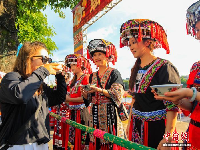 8月30日,游客喝攔門酒入場(chǎng)參加瑤族“湊份子”婚宴。楊宗盛 攝