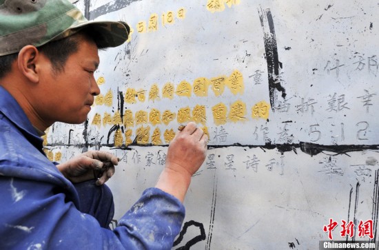 四川什邡市即將落成的長51.2米、高2.28米的地震詩歌墻位于穿心店“5·12”地震遺址廣場,以銘記2008年5月12日突如其來的災(zāi)難。經(jīng)專家篩選,蘇善生的《孩子,快抓緊媽媽的手》、王平久的《生死不離》等20首地震詩歌上墻,作者既有中國詩壇的名家,也有在網(wǎng)絡(luò)走紅的詩歌新人。圖為一名工人正在詩歌墻修建現(xiàn)場忙碌。(中新社發(fā) 劉忠俊 攝)
