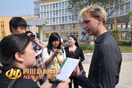 4月25日上午,“全國(guó)網(wǎng)絡(luò)媒體重返災(zāi)區(qū)看奇跡”大型采訪(fǎng)報(bào)道團(tuán)的記者們?cè)谥腔蹐@區(qū)遇到了22歲的德國(guó)小伙保羅,保羅目前在青川職業(yè)高中支教英語(yǔ)課程。雖然來(lái)四川只有8周,但是保羅已經(jīng)對(duì)青川產(chǎn)生了感情!暗卣鸬臅r(shí)候我從新聞中了解了很多情況,看了很多圖片,知道四川受到的破壞很大。但是沒(méi)想到三年的時(shí)間這里就發(fā)生了這么大的變化,到處是新建的房子和學(xué)校,你們真的了不起,我很感動(dòng)!