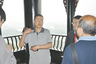 樊拓宇在重建后的秦堰樓向國家文物局專家介紹情況。 袁祺