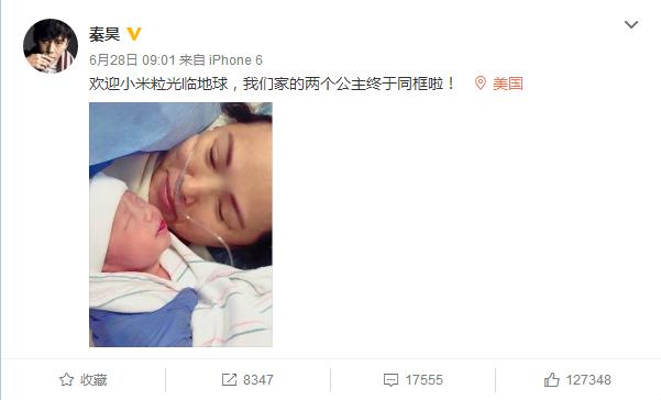6月28日,演員秦昊在微博中貼出一張妻子伊能靜與剛出生的女兒的合照,宣告家中迎來了新成員,“歡迎小米粒光臨地球,我們家的兩個公主終于同框啦!”,而剛剛順利產(chǎn)女的伊能靜也轉(zhuǎn)發(fā)微博并自稱是“哭得比小米粒皺的傻媽”。