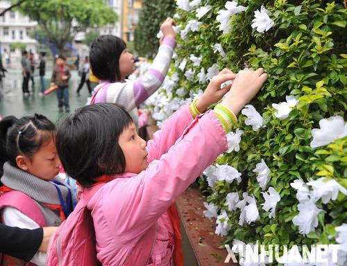 3月24日,福建省南平市實驗小學的學生上課前一一在校園內(nèi)的綠籬上系上小白花,以寄托對8名遇害同學的哀思。