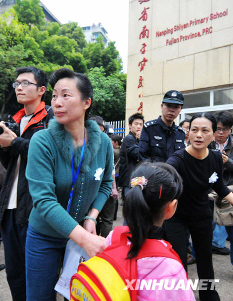 7時30分,南平市實驗小學的全體老師身著黑衣,胸佩白花,和警察一起排成人墻,站在校門外迎接經(jīng)過一日一夜身心折磨的孩子們。