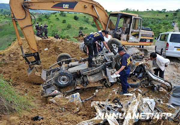 11月25日,在菲律賓馬京達(dá)瑙省安帕圖安鎮(zhèn),警方調(diào)查人員在一處犯罪現(xiàn)場搜尋證據(jù)、尋找遇害者遺體。當(dāng)日,菲律賓軍方說,菲安全部隊(duì)當(dāng)天又發(fā)現(xiàn)11具被綁架者遺體,從而使23日發(fā)生的政治綁架和屠殺事件的遇害者人數(shù)上升至57人。新華社/法新