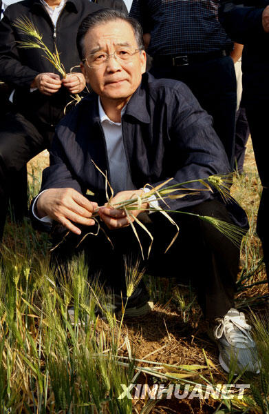 這是3月19日,溫家寶來到陸良縣芳華鎮(zhèn)獅子口村萬畝大麥?zhǔn)痉短铮瑢嵉夭炜崔r(nóng)作物受災(zāi)情況。 新華社記者 姚大偉 攝