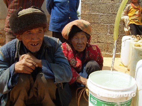 圖為21日在缺水較為嚴(yán)重的昆明東川區(qū)阿旺鎮(zhèn)?拼,92歲的劉世友與老伴正用水桶接取政府送來(lái)的生活用水。楊穎融 攝