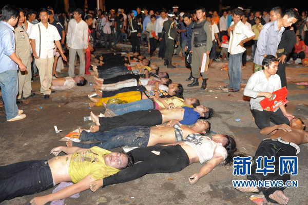 11月23日,在柬埔寨金邊,人們站在踩踏事件遇難者遺體旁。新華社/法新