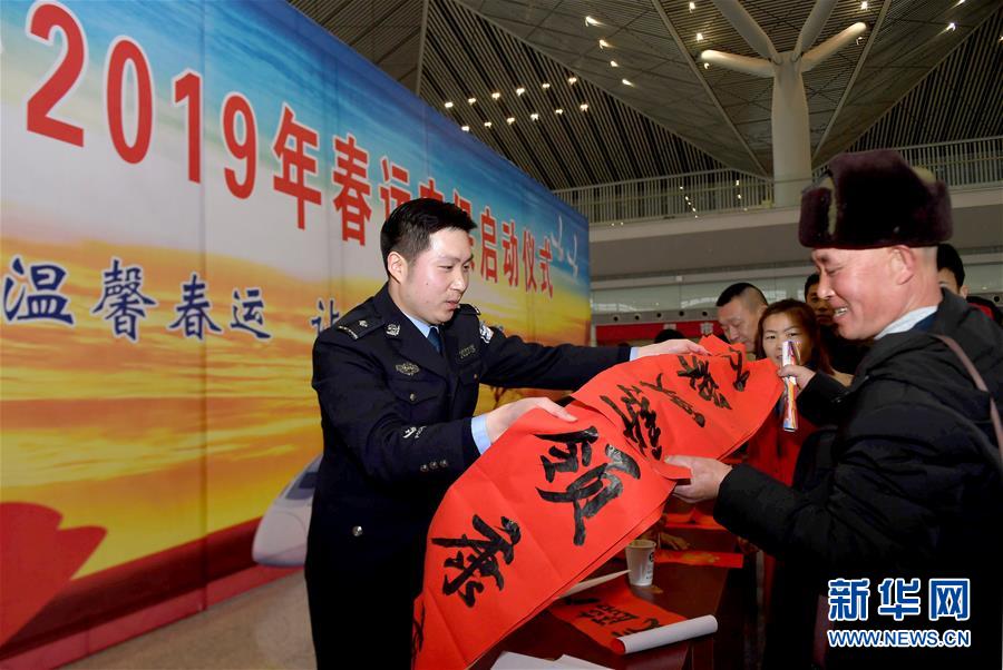 1月20日,在西安北客站,鐵路民警為旅客送上自己書寫的春聯(lián)。