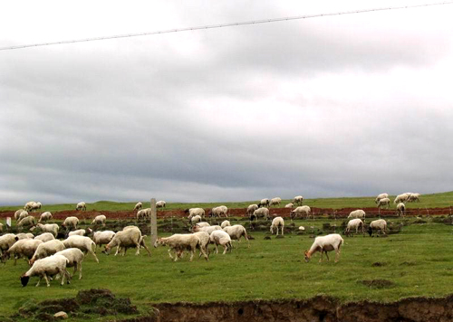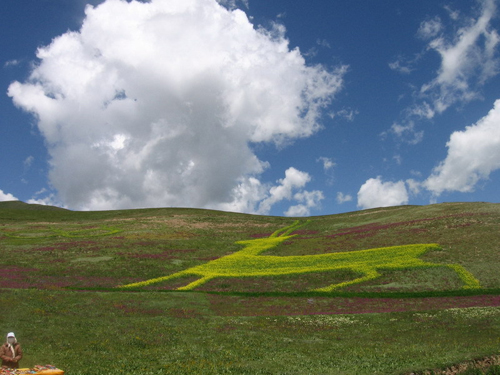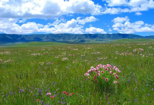 這里很美,美得足以讓你震顫;這里很高,高得讓你感覺藍(lán)天和白云伸手可及;這里是一片碧草如茵的大草原。草原的天,藍(lán)得醉人;草原的云,白得可心;草原的山,美得如畫,就連草原的空氣也甜得讓人心怡。浮云般的羊群,棕黑相間的牦牛,星星點(diǎn)點(diǎn)地徜徉在青草和野花叢中。不時(shí)有穿著藏服的藏民,騎著駿馬悠然地在草原上緩緩而來。遠(yuǎn)處,山巒起伏,偶有雄鷹飛過的身影,蓮花般的蒙古包散落在白云深處。