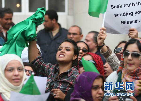 3月29日,在英國首都倫敦,反對西方國家在利比亞軍事行動的抗議者在利比亞問題國際會議會場外示威。利比亞問題國際會議當日在倫敦召開,40多位國際組織和國家代表與會。代表們對利比亞局勢進行討論,評估聯(lián)合國安理會決議執(zhí)行情況,并呼吁推進利比亞政治進程。新華社發(fā)(高塔姆攝)