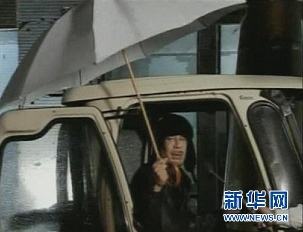 卡扎菲來到利比亞國家電視臺的視頻截圖照片。新華社\路透社
