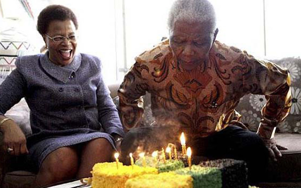 1992年曼德拉就與溫妮分居,1996年3月19日,法院判定曼德拉與溫妮離婚。現(xiàn)任妻子格拉薩·馬謝爾(Graca Machel) 是莫桑比克前總統(tǒng)薩莫拉的遺孀,1998年7月18日與曼德拉結(jié)婚。圖為2010年,南非前總統(tǒng)納爾遜·曼德拉(右)在約翰內(nèi)斯堡的家中與妻子一起慶祝自己的91歲生日。