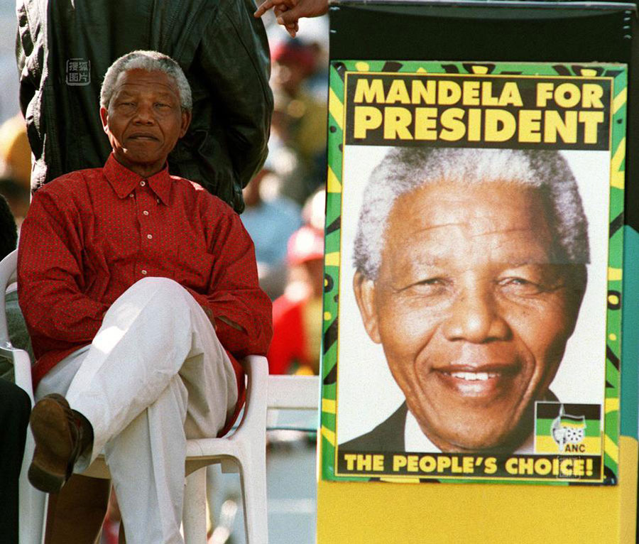 1994年4月23日,非國大主席曼德拉坐在自己南非總統(tǒng)競選海報旁邊。