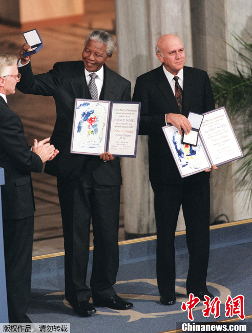 1993年10月15日,諾貝爾和平委員會授予曼德拉諾貝爾和平獎,以表彰他為廢除南非種族歧視政策所作出的貢獻(xiàn),和他一起受獎的還有時(shí)任南非總統(tǒng)德克勒克(右)。圖為1993年12月10日,諾貝爾和平獎頒獎典禮上,曼德拉和德克勒克向記者示意。