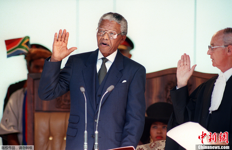 1994年5月9日,在南非首次不分種族大選結(jié)果揭曉后,曼德拉成為南非歷史上首位黑人總統(tǒng)。1999年6月曼德拉正式去職。圖為1994年5月10日,南非比勒陀利亞,曼德拉當(dāng)選總統(tǒng)后在聯(lián)合大廈發(fā)表就職演說。