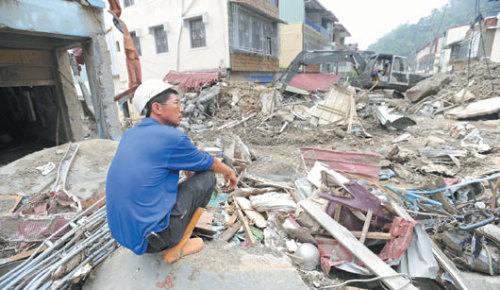 高雄縣那瑪夏鄉(xiāng)民族村在“莫拉克”風(fēng)災(zāi)中受創(chuàng)嚴重,一名村民看著被洪水與泥石流沖壞的房子,滿目凄涼。圖片來源:臺灣《聯(lián)合報》