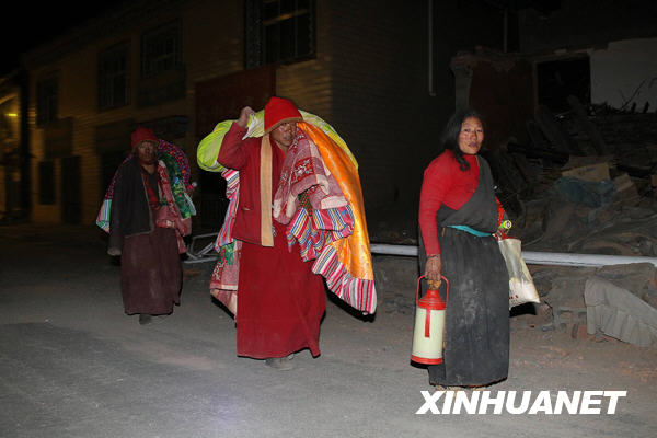 4月14日深夜,青海玉樹(shù)地震災(zāi)區(qū)受災(zāi)群眾扛著鋪蓋向安全的地方轉(zhuǎn)移。當(dāng)日7時(shí)49分,青海省玉樹(shù)藏族自治州玉樹(shù)縣發(fā)生7.1級(jí)地震,給當(dāng)?shù)厝嗣袢罕娚?cái)產(chǎn)造成嚴(yán)重?fù)p失。 新華社記者 邢廣利 攝