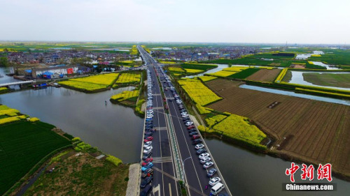 資料圖:2016年4月4日清明節(jié),也是清明小長假的最后一天,江蘇興化千垛菜花風景區(qū)游人如織,公路變也成了一個“超級停車場”。孟德龍 攝
