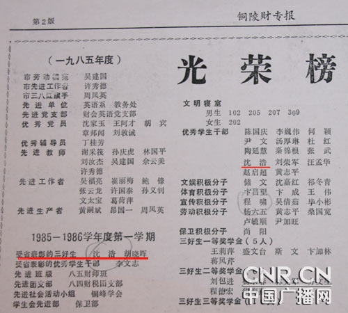 沈浩在上學(xué)期間所取得的成績(jī),當(dāng)時(shí)已經(jīng)改名。(中廣網(wǎng) 陳曉冉攝)