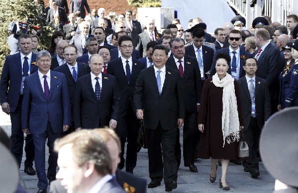習(xí)主席與夫人彭麗媛同普京親切握手,隨后在普京的陪同下,同出席慶典的其他貴賓步行前往紅場(chǎng),登上檢閱臺(tái),出席紅場(chǎng)閱兵儀式。檢閱臺(tái)上,習(xí)主席與普京并肩而立。