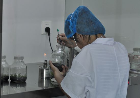 走進(jìn)六安安徽圣農(nóng)生物科技股份有限公司石斛培育基地,眼前一瓶瓶長(zhǎng)滿綠色小苗的植物立即吸引了記者的目光!斑@就是我們培育出來(lái)的霍山石斛小苗!”該公司董事長(zhǎng)拿出一個(gè)瓶子,里面密密麻麻長(zhǎng)著無(wú)數(shù)顆像草芽一樣的細(xì)小植物!捌勘谏系拿恳粋(gè)細(xì)小微粒,都可以長(zhǎng)出一顆米斛來(lái)!彼嬖V記者,他們采用的這種技術(shù)叫“植物組織培養(yǎng)”,其實(shí)就是植物“克隆”,即利用植物的體細(xì)胞進(jìn)行分裂培育,來(lái)孕育新生命。
