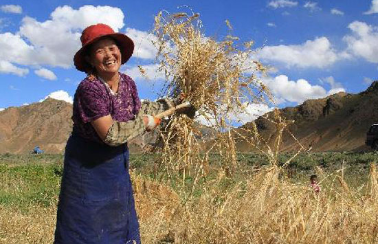 9月7日,西藏日喀則市甲措雄鄉(xiāng)塔康村村民次白吉珍在收割青稞。