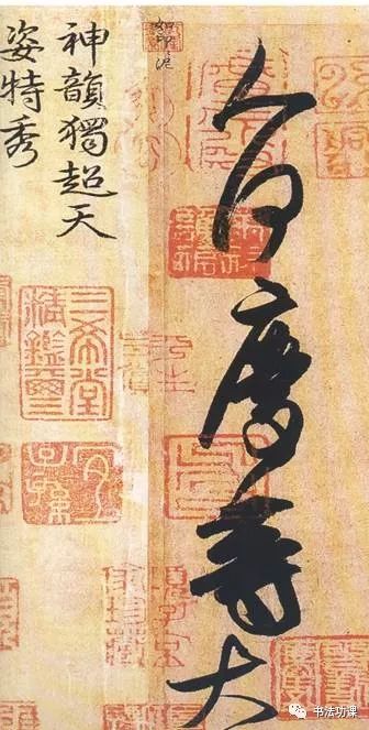 與此帖中其他21字相比, “相” 字給人突兒蹊蹺之感,引人思索。過(guò)了“相”字,筆鋒再次急起直追,震蕩綿回直至終了。正是“大鵬轉(zhuǎn)風(fēng),長(zhǎng)鯨噴浪懸崖墜石,驚電遺光”。