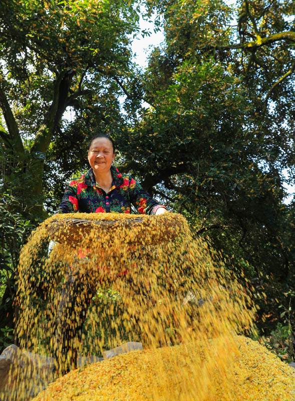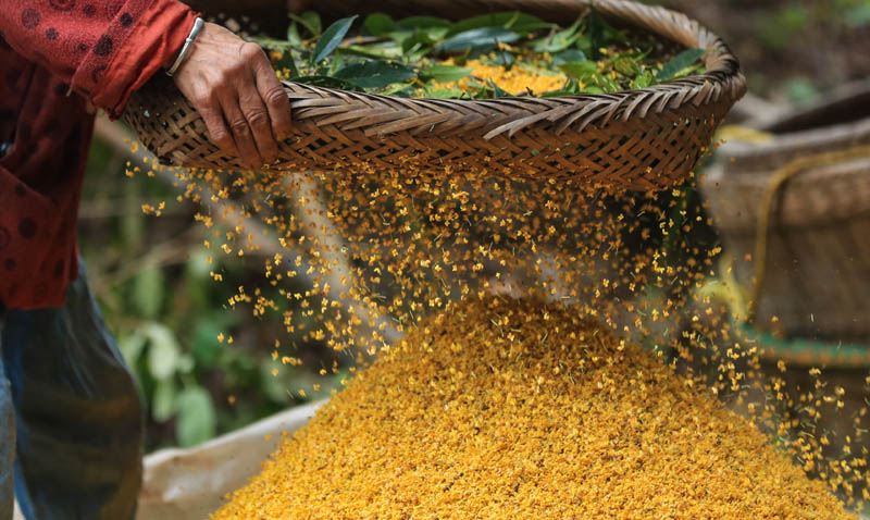 9月24日,四川省瀘州市江陽(yáng)區(qū)鄰玉街道天堂村的村民在加工桂花。