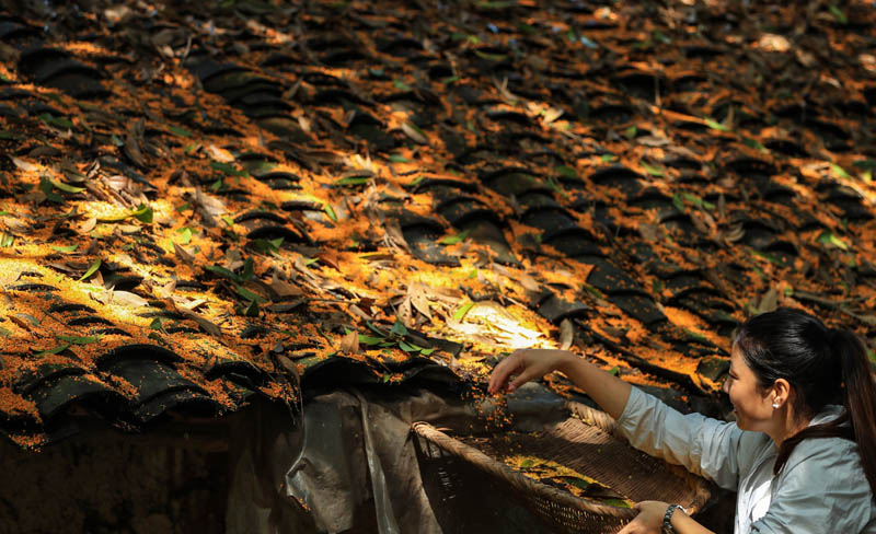 9月24日,四川省瀘州市江陽(yáng)區(qū)鄰玉街道天堂村的村民在收撿散落在房頂上的桂花。