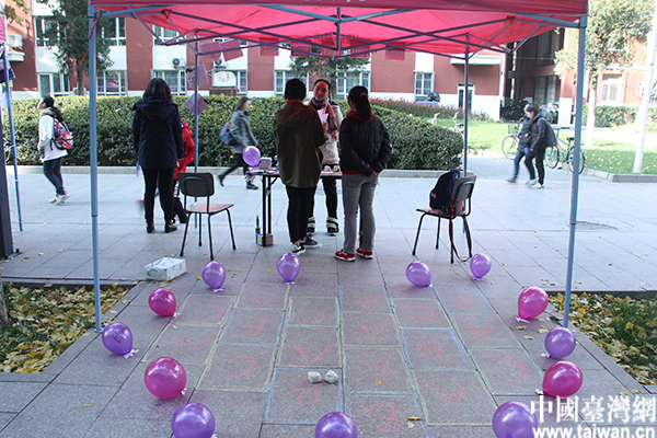 北京師范大學(xué)兩岸四地青年交流協(xié)會(huì)的學(xué)生們?cè)缭绲貋淼襟w育館外布置攤位,他們?yōu)閮砂端牡厍嗄杲涣魉龅呐,如同?yáng)光在這個(gè)寒冷的初冬讓人感到溫暖。