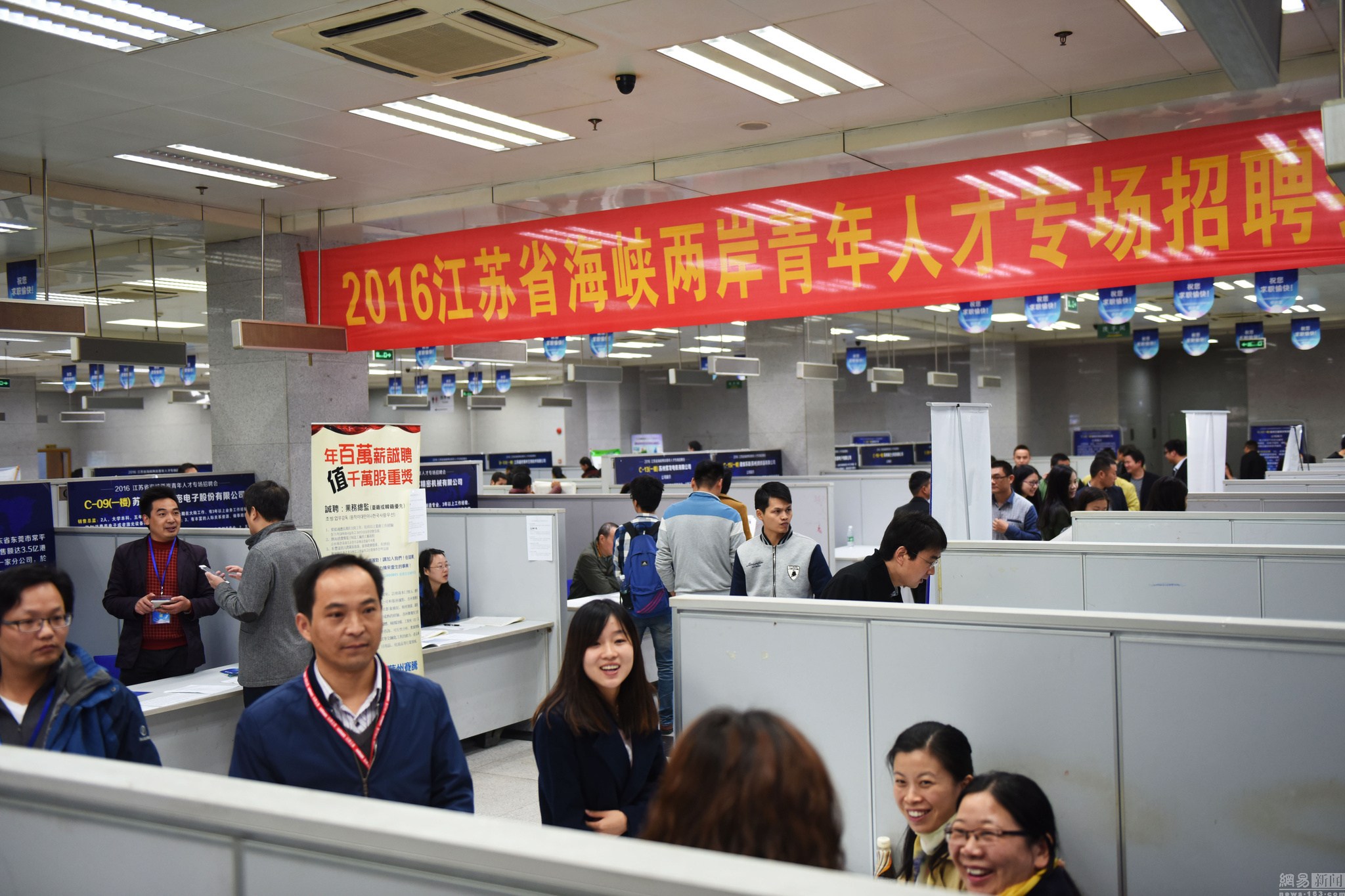 2016年11月12日,江蘇省首屆海峽兩岸人才交流大會(huì)在蘇州市吳江區(qū)舉行,吸引了1000多名臺(tái)灣青年人才參與線上線下的招聘活動(dòng),其中,有800多名臺(tái)灣青年和在蘇部分高校就讀的臺(tái)灣大學(xué)生將參加現(xiàn)場(chǎng)招聘會(huì)。國(guó)臺(tái)辦經(jīng)濟(jì)局局長(zhǎng)張世宏在開(kāi)幕式上表示,受大陸廣闊的市場(chǎng)空間和良好的發(fā)展前景吸引,近年來(lái)越來(lái)越多的臺(tái)灣年輕人選擇到大陸就業(yè)創(chuàng)業(yè),大陸正日益成為廣大臺(tái)灣青年謀求個(gè)人發(fā)展的熱土。圖為江蘇省首屆海峽兩岸人才專(zhuān)場(chǎng)招聘活動(dòng)現(xiàn)場(chǎng),海峽兩岸青年正在找尋自己心儀的工作。