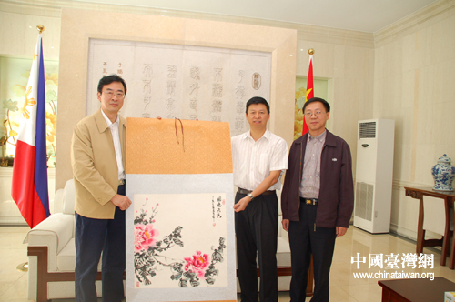 1月19日,第三屆“中國和平統(tǒng)一亞洲論壇”在馬尼拉圓滿閉幕。翌日(20日),中國統(tǒng)促會執(zhí)行副秘書長李路、副秘書長傅鐵生應(yīng)邀前往中國駐菲大使館,與中國駐菲律賓特命全權(quán)大使宋濤進行座談,并向宋濤大使贈送精美禮品!。ㄌ镌迄i 攝)