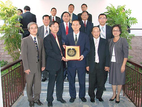 楊啟秋會(huì)長(zhǎng)(前排中)和傅鐵生副秘書(shū)長(zhǎng)互送紀(jì)念品。(圖:柬埔寨星洲日?qǐng)?bào))