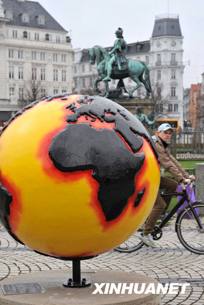 12月7日,哥本哈根市中心一個(gè)反映全球氣候變化的模型吸引了騎車(chē)人的注意。新華社記者徐速繪攝