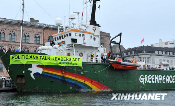 12月7日,綠色和平組織的船只在哥本哈根進(jìn)行宣傳活動(dòng)。當(dāng)?shù)貢r(shí)間7日上午,聯(lián)合國(guó)氣候變化大會(huì)在丹麥?zhǔn)锥几绫竟_(kāi)幕。圍繞著環(huán)保和氣候變化主題,各種形式的宣傳活動(dòng)在會(huì)場(chǎng)內(nèi)外展開(kāi)。新華社記者徐速繪攝
