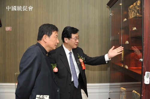 中國(guó)和平統(tǒng)一促進(jìn)會(huì)執(zhí)行副秘書長(zhǎng)李路(右)和副秘書長(zhǎng)王安南(左)參觀展覽
