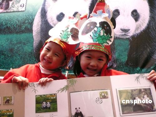 1月20日,為慶祝大陸贈(zèng)臺(tái)兩只大熊貓“團(tuán)團(tuán)”“圓圓”到臺(tái)灣落戶,臺(tái)灣“中華郵政”舉行“可愛動(dòng)物郵票——大熊貓”郵票及郵折發(fā)行典禮。本次發(fā)行的大熊貓郵票一組含郵票兩枚及小型張一張,分別為大熊貓團(tuán)團(tuán)(面值新臺(tái)幣五元)、圓圓(面值九元)和團(tuán)團(tuán)圓圓小型張(面值二十五元),各發(fā)行一百萬張!翱蓯蹌(dòng)物郵票——大熊貓”郵折一本,內(nèi)含上述大熊貓郵票一組、小型張樣張一張、貼有團(tuán)團(tuán)郵票的首日封及原圖明信片一組三張,每本售價(jià)新臺(tái)幣一百八十元,限量二萬五千套。圖為臺(tái)灣小朋友扮成大熊貓模樣展示郵折。 中新社發(fā) 路梅 攝