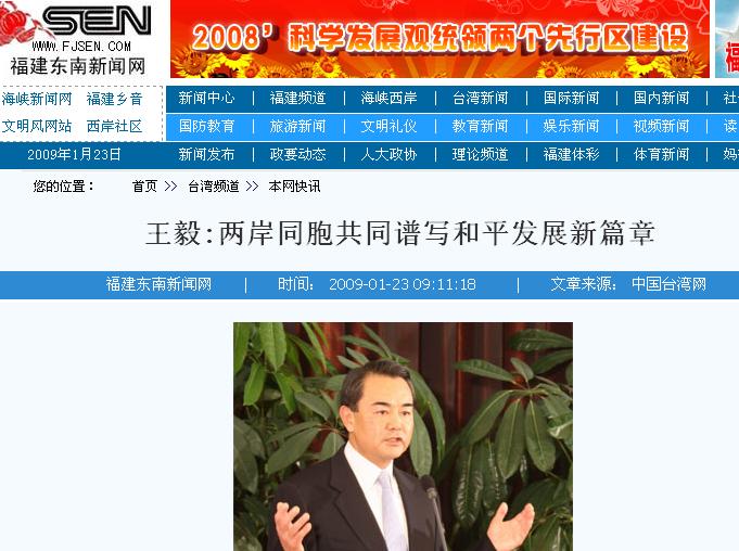 中共中央臺辦、國務(wù)院臺辦主任王毅今天向臺灣同胞發(fā)表2009年新春賀辭——《兩岸同胞共同譜寫和平發(fā)展新篇章》