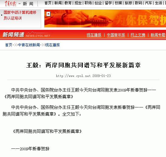中共中央臺辦、國務(wù)院臺辦主任王毅今天向臺灣同胞發(fā)表2009年新春賀辭——《兩岸同胞共同譜寫和平發(fā)展新篇章》