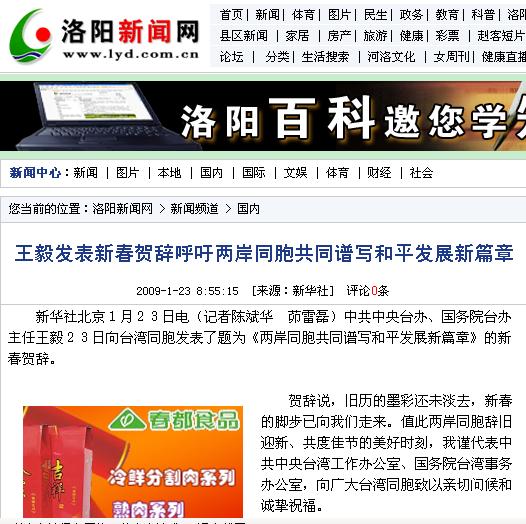 賀辭說,回首2008年,兩岸關(guān)系玉汝于成,峰回路轉(zhuǎn)。展望2009年,兩岸關(guān)系方向明確,前景光明。在新的一年里,中共中央臺辦、國務(wù)院臺辦將堅定不移地堅持中央對臺大政方針,全面貫徹落實胡錦濤總書記重要講話精神,牢牢把握兩岸關(guān)系和平發(fā)展的主題,不斷開創(chuàng)兩岸關(guān)系和平發(fā)展的新局面。