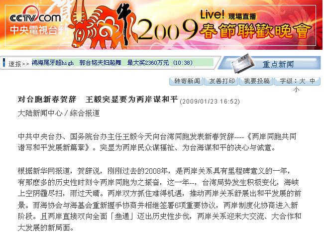 中共中央臺辦、國務(wù)院臺辦主任王毅今天向臺灣同胞發(fā)表新春賀辭----《兩岸同胞共同譜寫和平發(fā)展新篇章》。突顯為兩岸民眾謀福祉、為臺海謀和平的決心與誠意。
