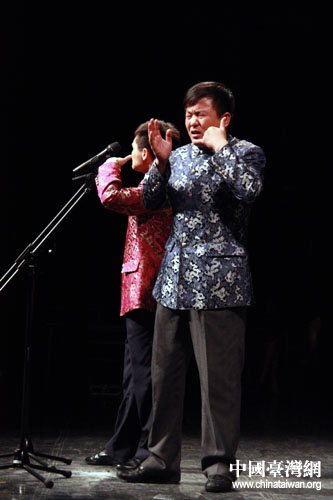 中國(guó)臺(tái)灣網(wǎng)5月18日嘉義消息 5月17日晚上,嘉義縣表演藝術(shù)中心迎來(lái)了“第十一屆京味文化——臺(tái)灣嘉義親情之旅”一行的表演藝術(shù)家、工藝美術(shù)大師們。應(yīng)寧、王磊表演的《雙簧》,何云偉、李菁帶來(lái)的《學(xué)啞語(yǔ)》,李偉建、武賓經(jīng)典段子《咨詢熱線》,以及由臺(tái)北曲藝團(tuán)帶來(lái)的快板《雙鎖山》,相聲《地理圖之阿寶要脫團(tuán)》,讓當(dāng)晚嘉義縣表演藝術(shù)中心的觀眾從頭笑到尾。(記者 董潔 圖/文)