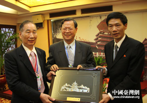 貴州省貴陽市市長李再勇(右一)向臺灣嘉賓贈送帶有貴陽民族特色的紀(jì)念品(貴陽市臺辦 胡珊珊 攝)